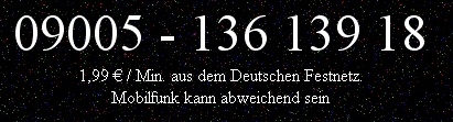 Ich bin zärtlich, aber ich habe auch eine versaute bizarre Ader und steh auf NS Spiele und Kaviar Sex.Schön versaut und derb mag ich es.schmutzigen dirty Talk und Anal Sex mit einbegriffen.Wer von euch hat nun Lust mit mir alten Feger schweinischen Telefonsex zu machen,ihr werdet euch wundern.ruft an ![]() ![]() |